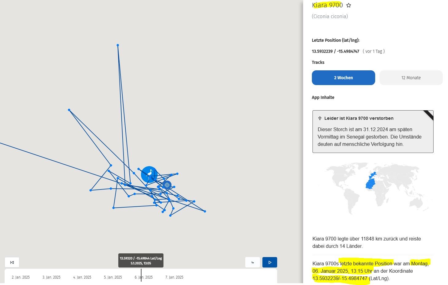 Liebe Isi, kannst Du wegen Kiara bitte nochmals schauen, ob es sicher ist, dass der Sender mit einem Auto transportiert wurde?Breisgau Stoerche hat geschrieben: Sa 4. Jan 2025, 14:30Und ja, es sieht ganz danach aus, dass der Sender -mit oder ohne Kiara - in einem Auto "nach Hause" transportiert wird. Jedenfalls liegt der Sender in ruhiger Lage, wird nicht gedreht etc., was beim Gehen ja nicht so gegeben ist. Und ja, nach einer Bergung sieht das auch nicht aus...... was auch unrealistisch sein dürfte...