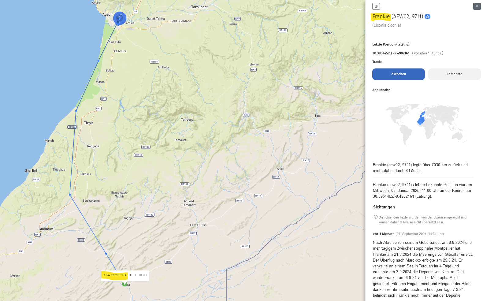 Ja, es scheint Frankie gut zu gehen.Frank B hat geschrieben: Mo 6. Jan 2025, 21:40Allerdings wurden heute recht viele Daten seiner Rückreise aus Mali nach Agadir gesendet. Die zu Weihnachten vorhandene Gerade entwickelt sich immer mehr zu einer Kurve. Vielleicht wissen wir zum Wochenende mehr über Frankies Rückreiseroute von Mali nach Agadir, zumindest scheint es ihm gut zu gehen