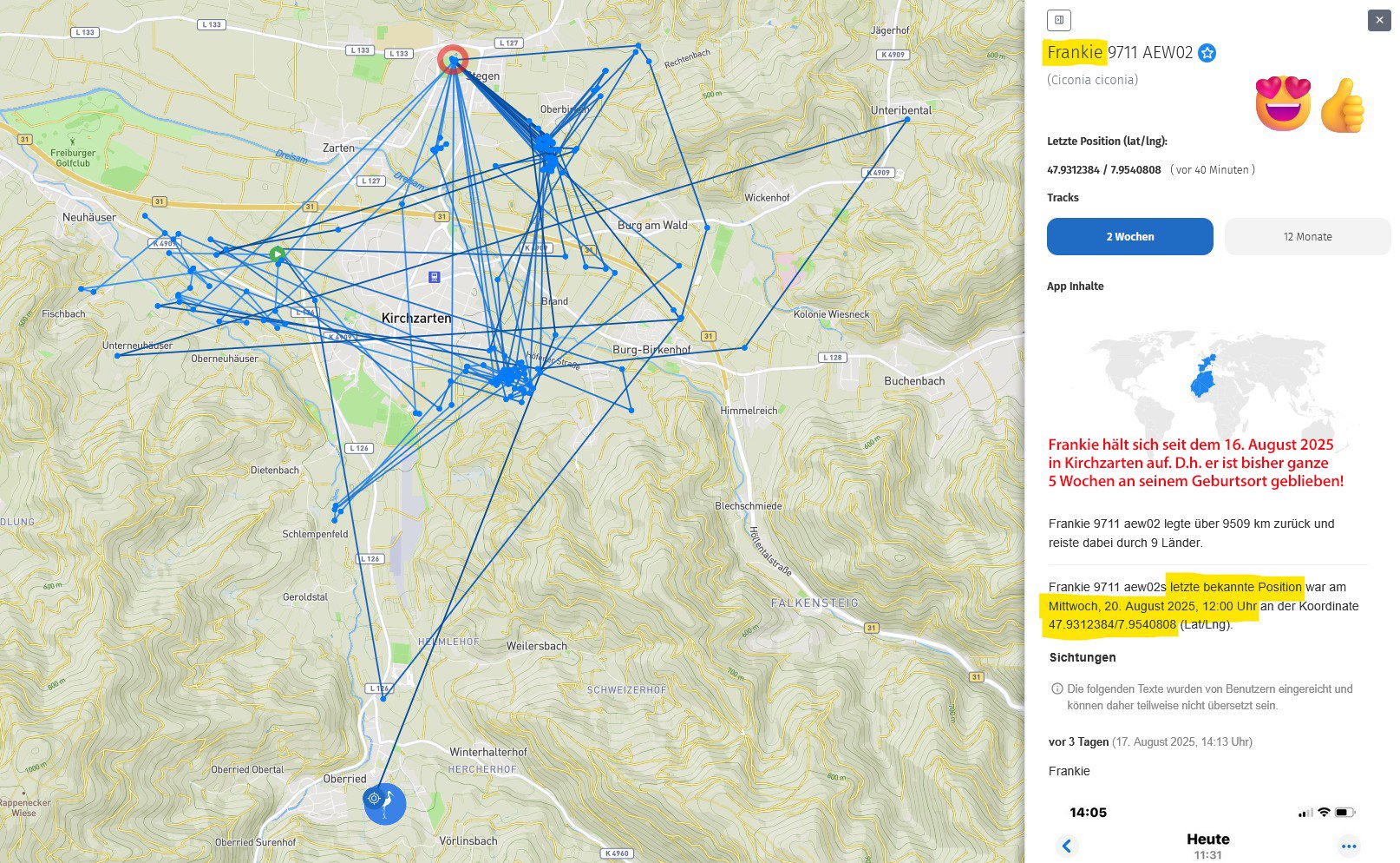 Ob er bereits heute Kirchzarten verlassen hat (weil die letzte Ortung heute Mittag so südlich ist), werden wir wohl erst morgen erfahren, aber ich schätze, er bleibt noch ein Weilchen. Zumindest würde ich mir das wünschen. ;)