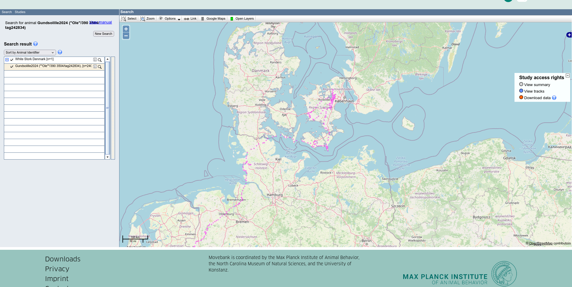 Schaut man sich das Ganze in der Movebank an, dann sieht es so aus: