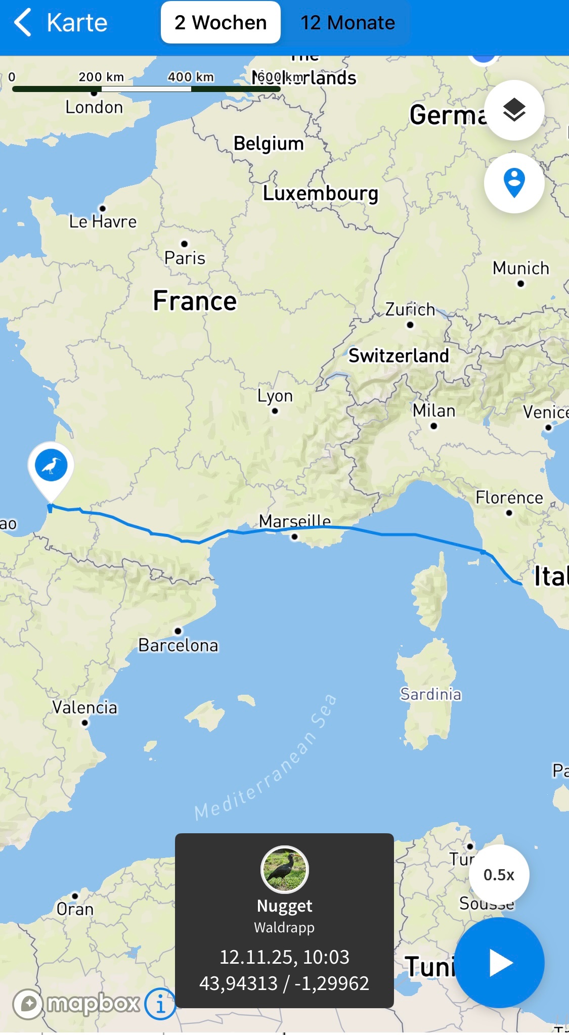 nachdem mir vor ein paar Tagen ebenfalls aufgefallen war, dass Nugget nicht mehr in Italien, sondern in Südfrankreich weilt, dachte ich, dass es doch nicht sein könne, dass er innerhalb weniger Tage diese Wahnsinnsstrecke zurückgelegt hat - und dabei noch ca. 300 km über‘s Mittelmeer. Ich habe daraufhin Herrn Dr. Fritz vom zuständigen Waldrapp - Team angeschrieben und sofort eine bestätigende Antwort bekommen. Da ich nicht sicher bin, ob ich diese zitieren darf, fasse ich sie einmal kurz zusammen.