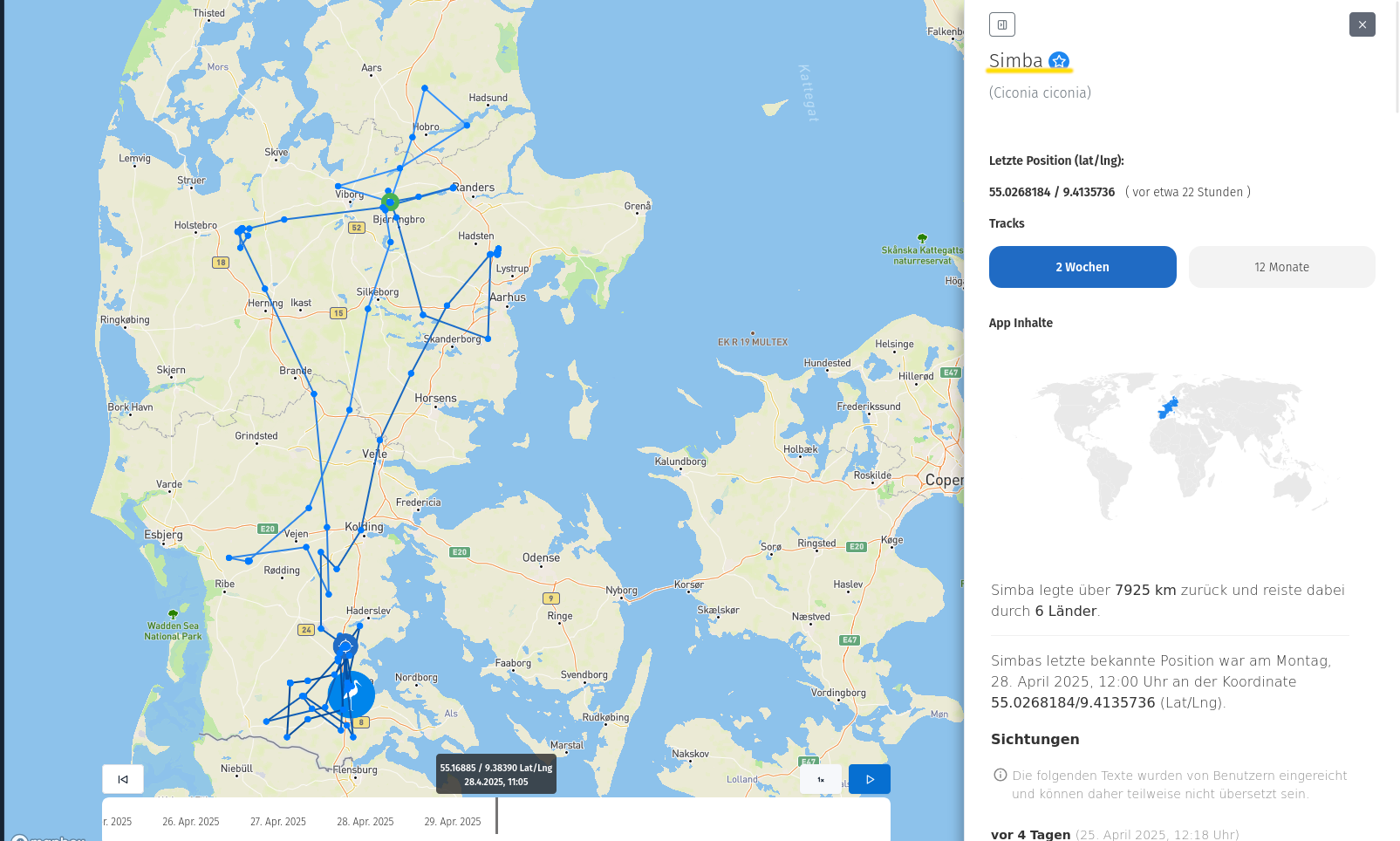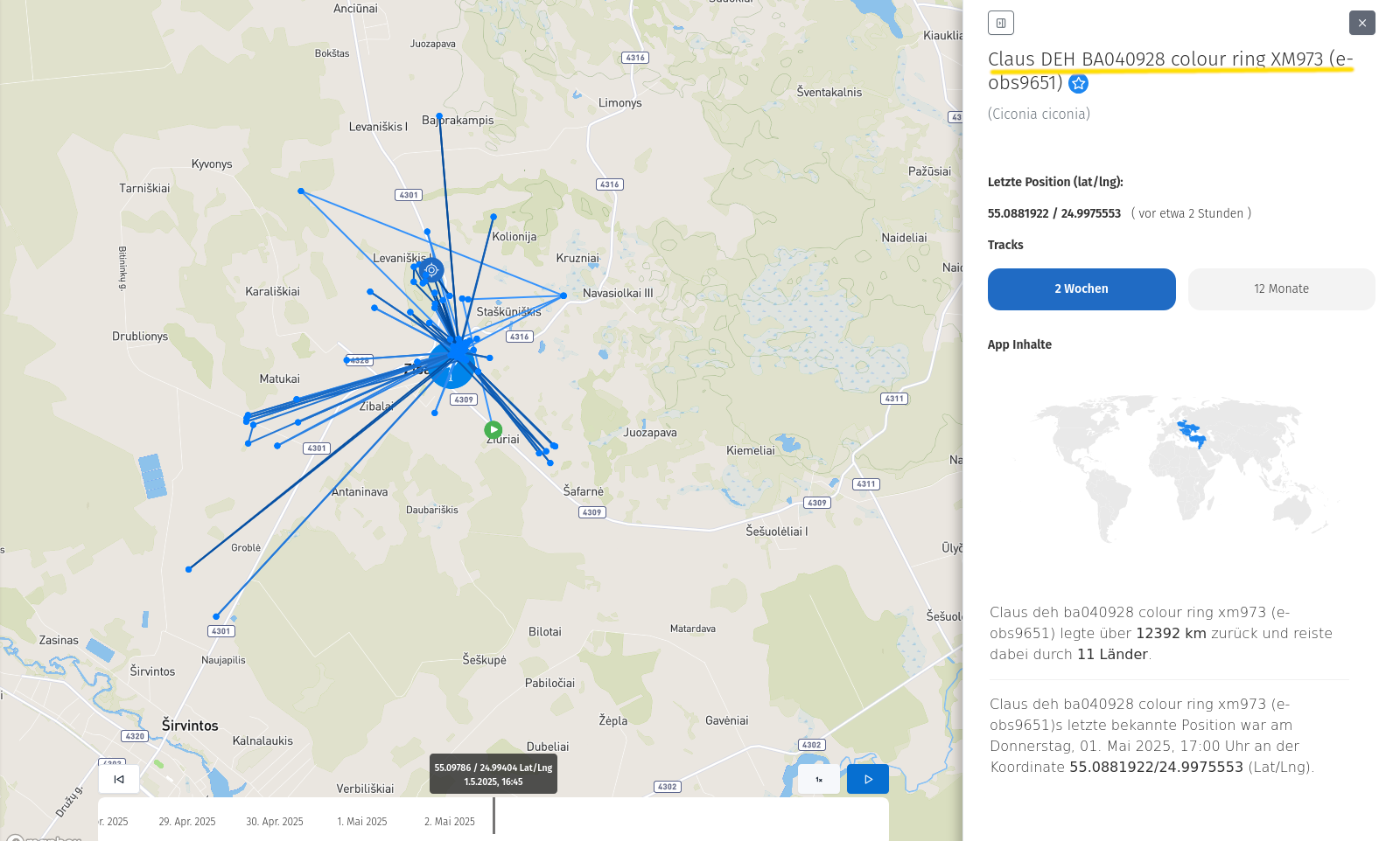 Claus . Unvergessen bleibt sein Sensations-Flug über einen Zipfel des Schwarzen Meeres. Inzwischen sieht es sehr stark danach aus, als wäre Claus in Litauen heimisch geworden. Wenn ich mir den aktuellen 14-Tages-Scan ansehe, dann habe ich den Eindruck, er hat ein Nest gefunden.