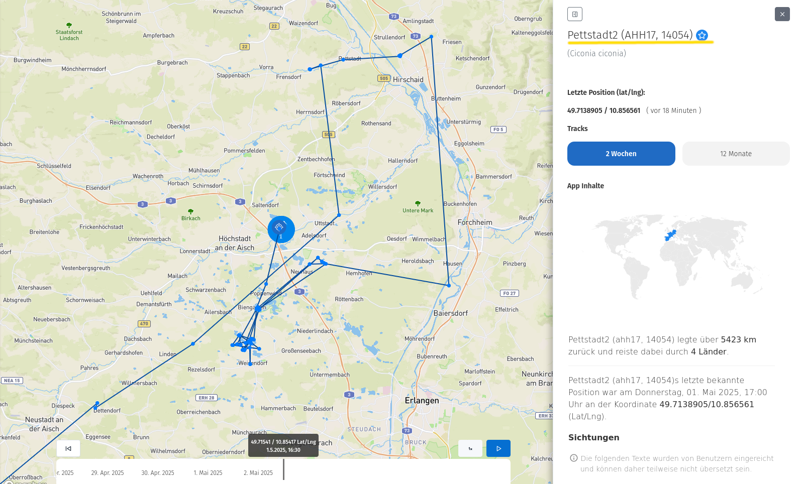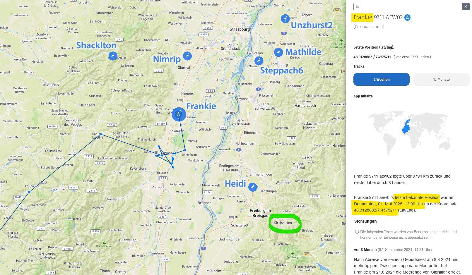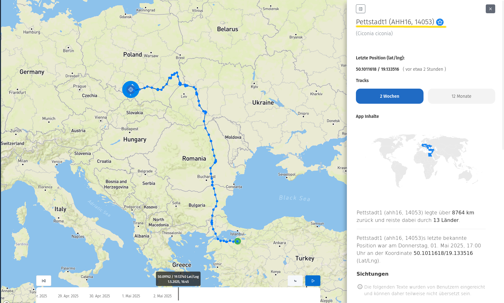 - Pettstadt1 am 1. Mai 2025. Sie ist noch rund 600 Kilometer von 'Zuhause' entfernt. Heute ist sie immer noch in Polen, aber sehr nahe der Grenze zu Tschechien.