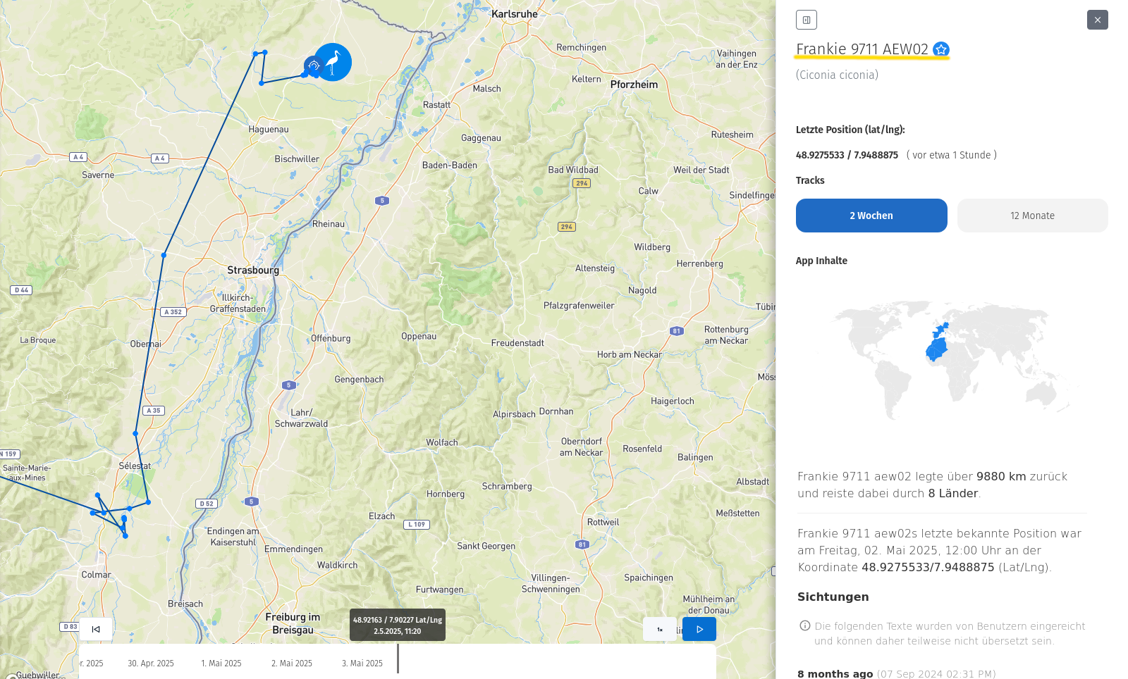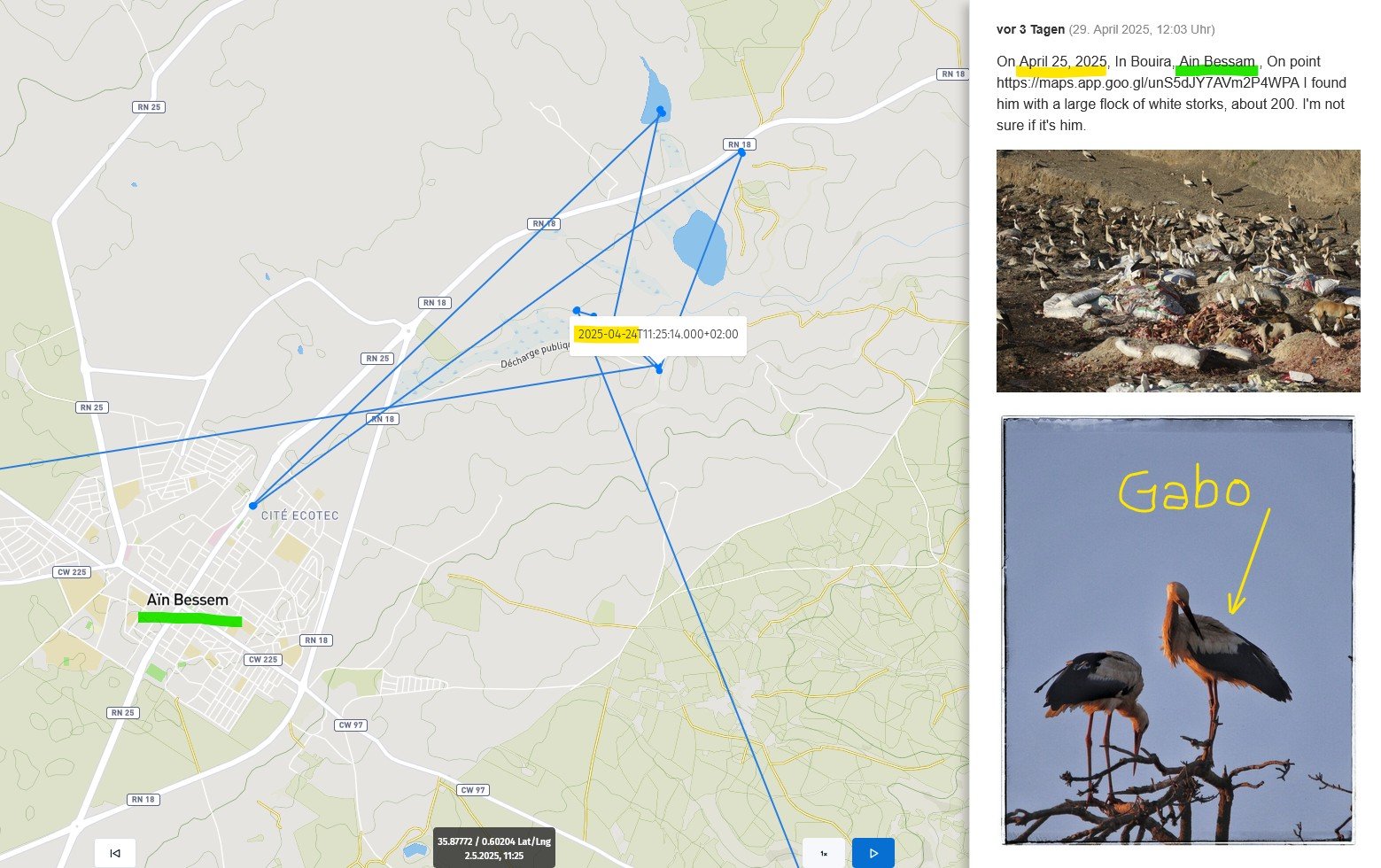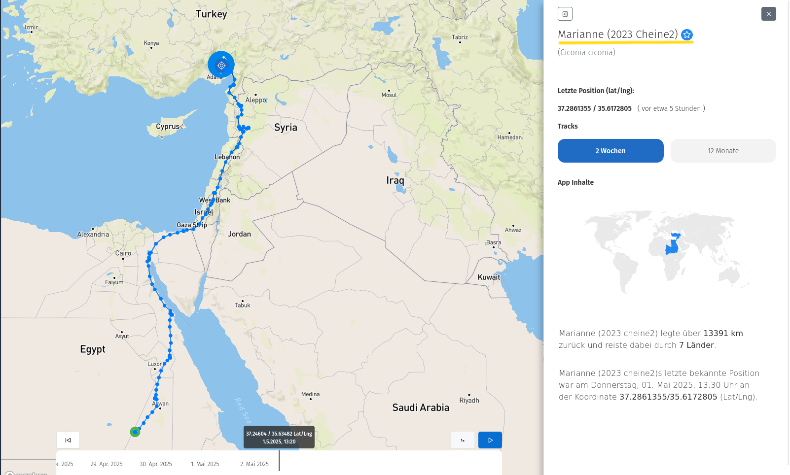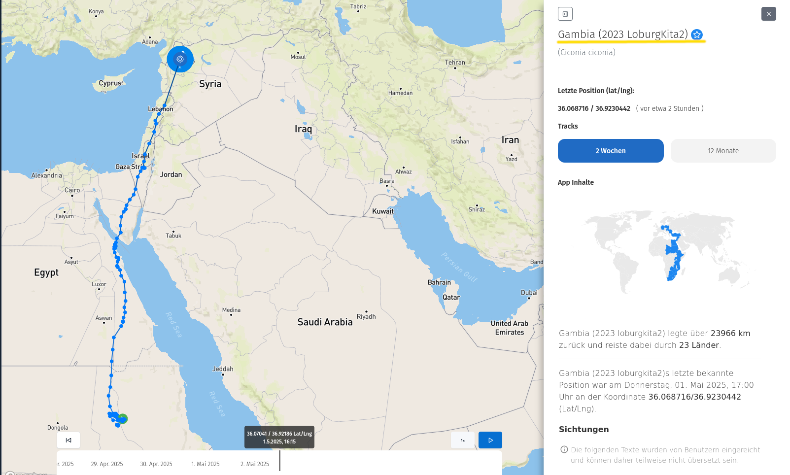 Gambia . Sie wurde 2023 geboren, flog im ersten Herbst die Westroute und blieb während des Winters in Spanien. Ihren zweiten Winter verbrachte sie allerdings dann in Afrika - damit wurde sie zur Ostzieherin. Im Moment ist sie immer noch auf dem Heimweg und hat mittlerweile Syrien erreicht. Man achte einmal auf den 'Kilometer-Stand'! Gambia hat fast 24.000 Kilometer unter ihren Flügeln!