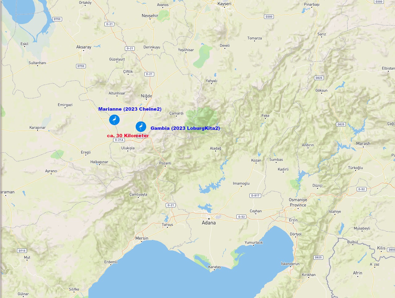 diesmal schreibe ich nicht zu Frankie sondern zu Gambia. Sie scheint es ein bisschen eiliger zu haben, sie ist seit gestern in 24h knapp 300km geflogen und befindet sich nun im Südosten der Türkei, nordwestlich von Adana