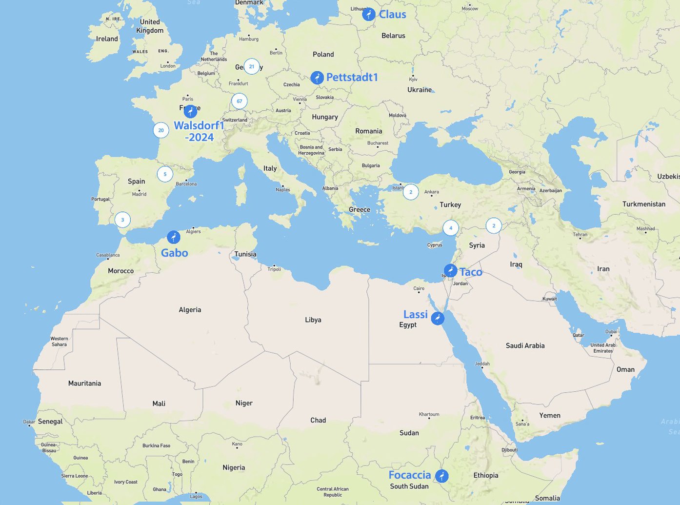 Nigiri , Tortilla und Dosa aus dem polnischen Storchenprogramm (Ecotrap White stork 2024 Poland). Weiterhin Marianne (2023 Cheine2) aus Cheine und die Weitfliegerin Gambia aus Loburg. Und dann noch Marmalade , die ebenfalls zum polnischen Sender-Programm von 2024 gehört. Quelle: https://www.animaltracker.app
