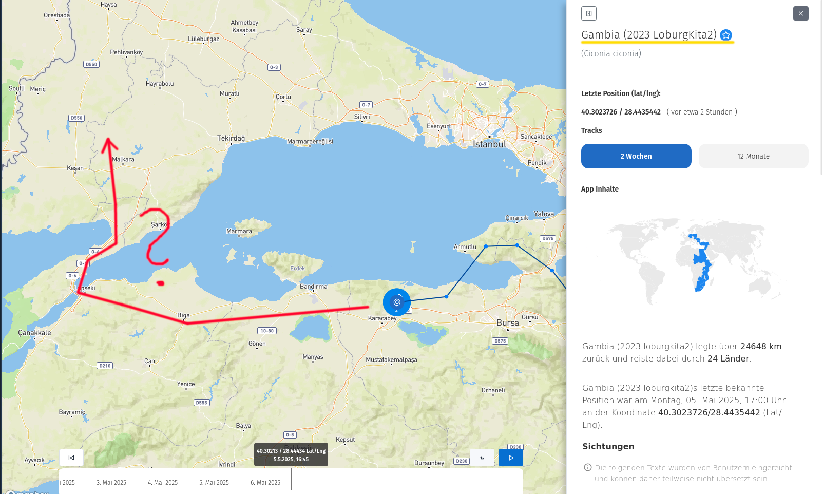 Wie bei Pettstadt1 vor rund 14 Tagen, stellt sich nun auch bei Gambia die Frage, wie wird sie weiter fliegen? Ich schätze mal, sie wird westlich am Marmara-Meer vorbei Richtung Norden ziehen. Das habe ich hier entsprechend skizziert: Quelle: https://www.animaltracker.app