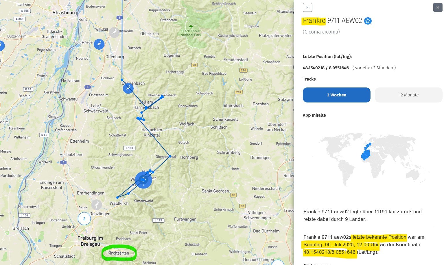 BSine hat geschrieben: Mo 7. Jul 2025, 17:52Auch Eddie, Ullas Partner 2019, kann man nicht böse sein, dass er im Mai 2019 das Nest in Kirchzarten verlassen und Ulla mit den Küken zurückgelassen hat, die kurz darauf verstarben. Die Bilder auf der Kirchzartener Homepage zeigen im Mai 2019 katastrophale Wetterverhältnisse mit Schnee und Nässe. Die Jungen waren nicht mehr zu retten, und ob Eddie selbst überlebt hat, ist auch nicht sicher, denn er ist wohl seitdem nirgendwo mehr abgelesen worden.