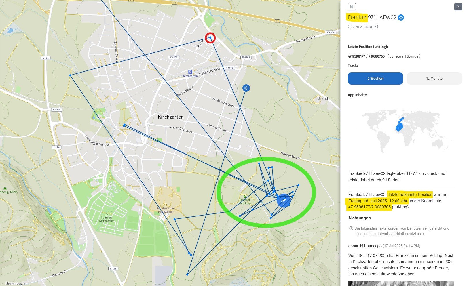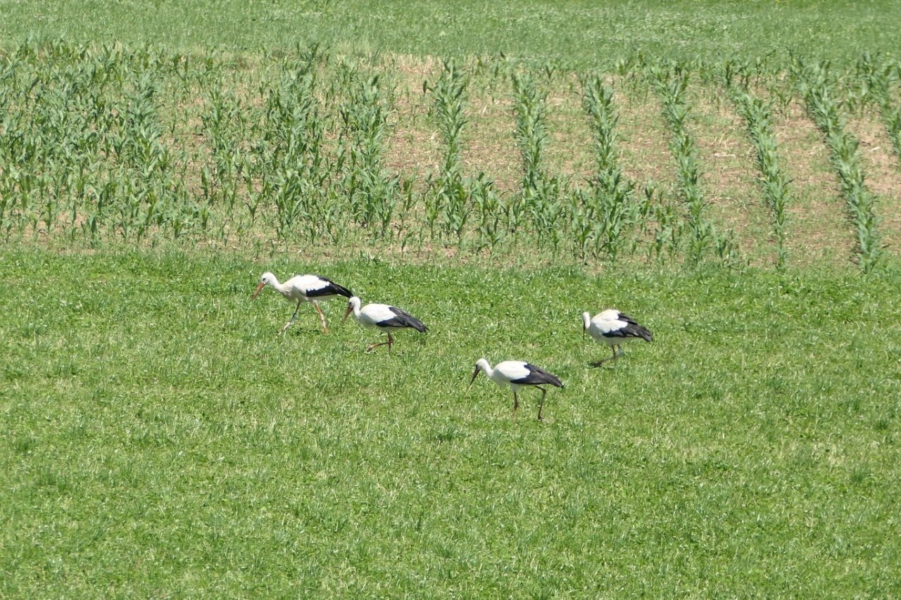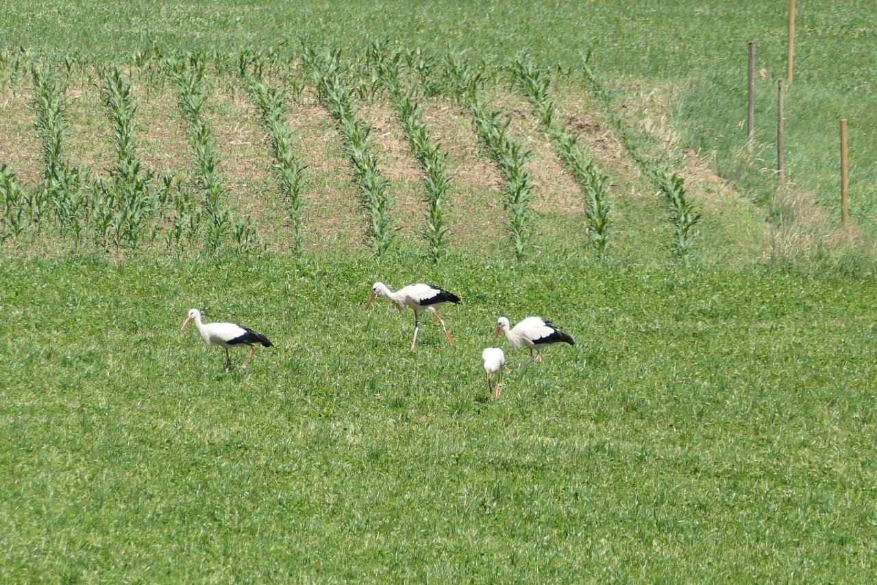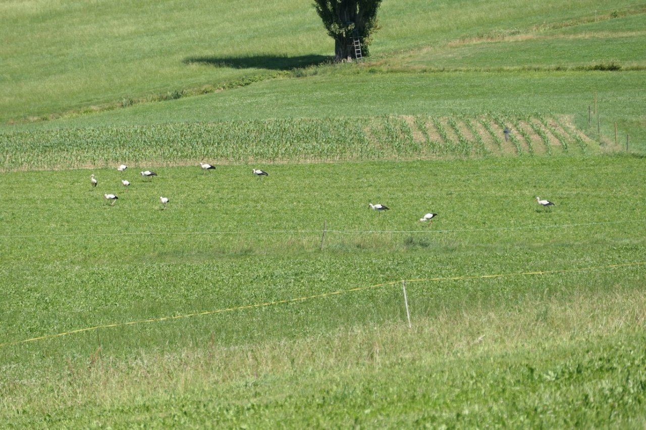 Herr Bickel konnte zur Mittagszeit Frankie auf den Wiesen des Giersberg entdecken. Zuvor hatte er dort lediglich Ulla und Edgar mit ihren Jungstörchen, zwei weitere Jungstörche sowie fünf unberingte Störche beobachten können. Gerade als er sein Spektiv zusammengepackt hatte, flog plötzlich ein einzelner Storch ein. Wie schön, dass für diesen einzelnen Storch das Spektiv nochmals ausgepackt wurde – es war nämlich Frankie!
