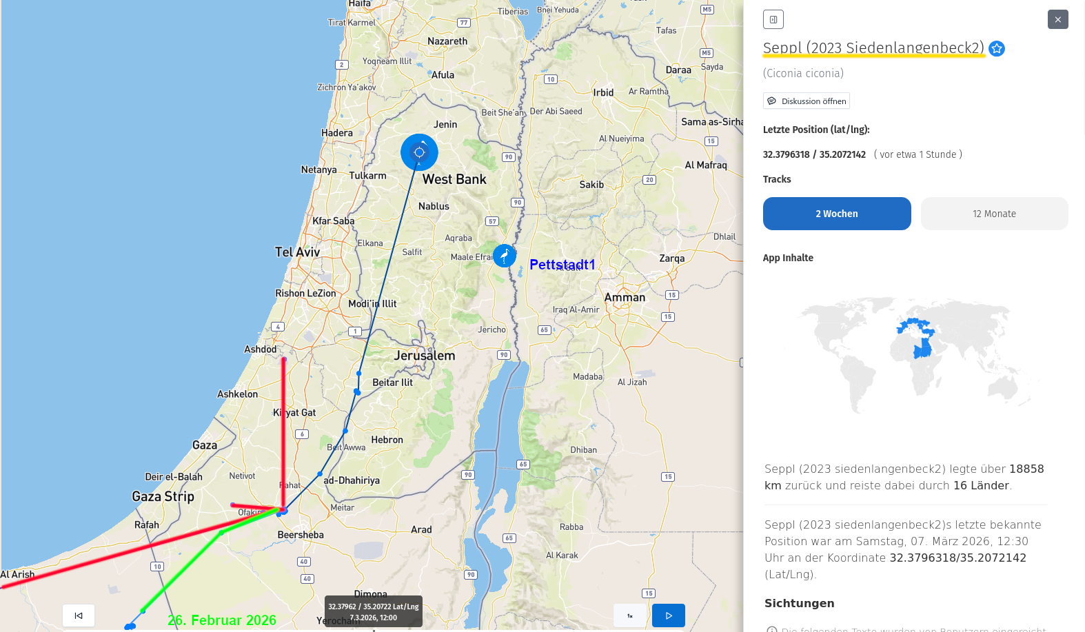 Ich kann hier von Seppl und auch von Pettstadt1 jeweils kaum Bewegung zeigen. Aber bei beiden Störchen gibt es merkwürdige Ausreißer, also Signale, die nicht nachvollziehbar sind. Das kommt ja immer mal wieder selten vor, dass mit einmal Strecken angezeigt werden (z.B. weit auf das offene Meer hinaus), wo klar ist, es kann nur ein Signalfehler sein. Weil aber nun sowohl bei Seppl als auch bei Pettstadt1 aus meiner Sicht solche Auffälligkeiten zu sehen sind, wollte ich das hier zeigen. Wie gesagt, ich will nicht spekulieren, was das zu bedeuten hat. Einzig der Gedanke daran, dass dort unten gerade Krieg herrscht, was ggf. auch Funk-Einschränkungen etc. bedeuten könnte, will ich erwähnen.